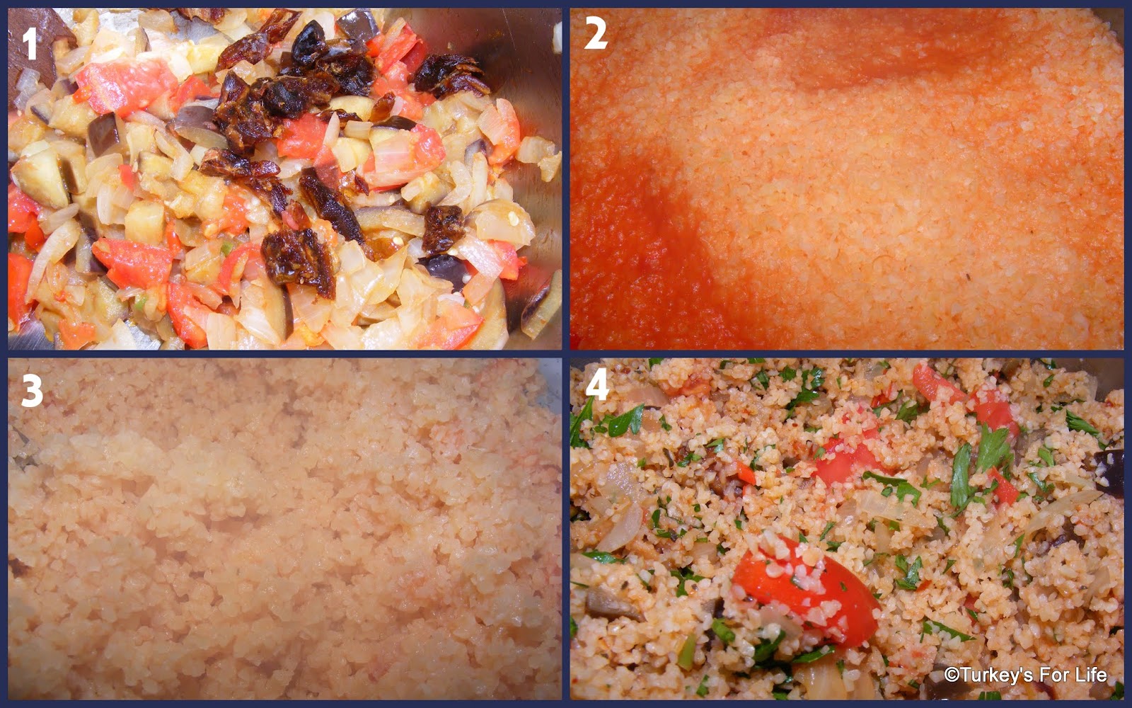- Stir until the salça has mixed in and pour over the bulgur wheat. Cover with a tea towel until all the water is absorbed by the bulgur. (Image 2).
